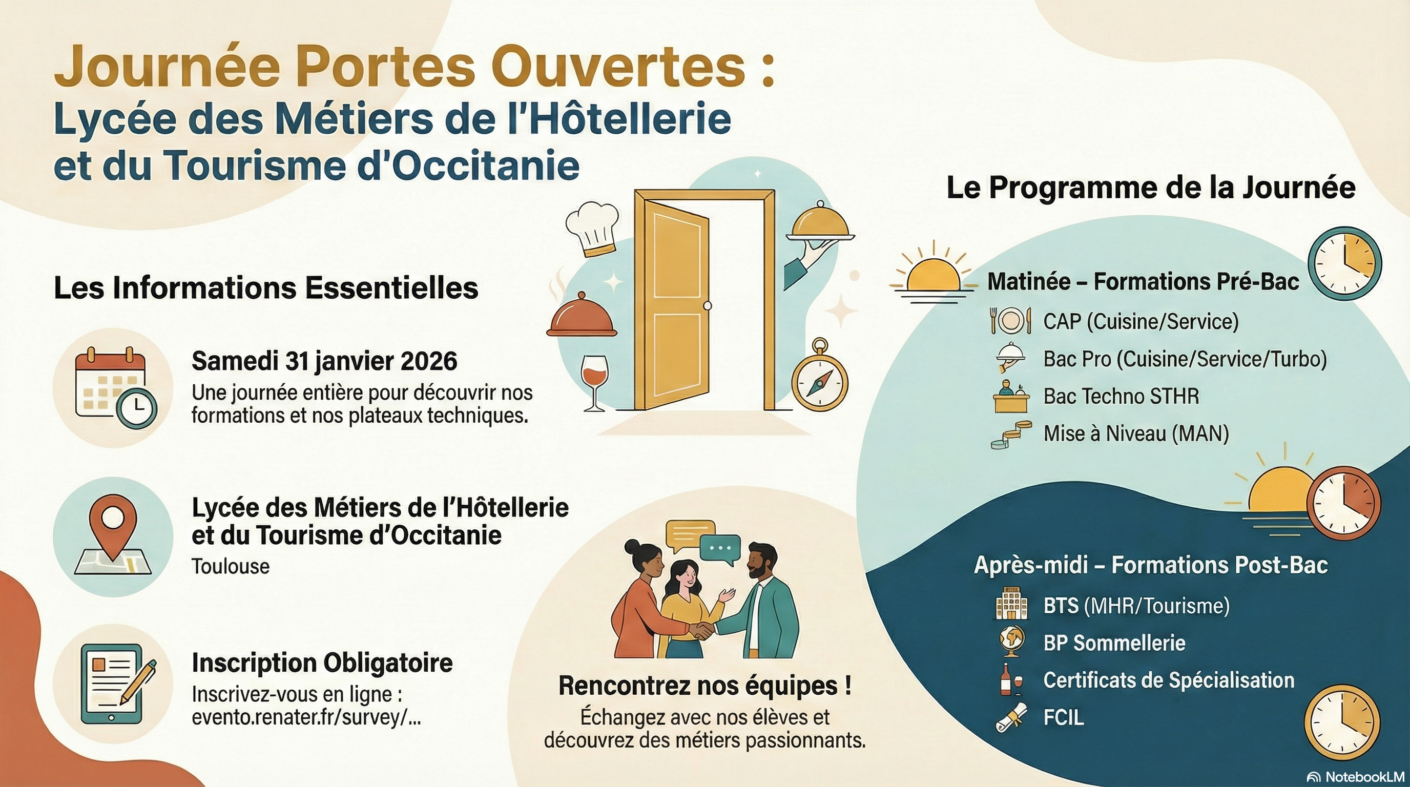 Le Lycée des Métiers de l’Hôtellerie et du Tourisme d’Occitanie a le plaisir de vous informer de l’organisation de sa Journée Portes Ouvertes, qui se tiendra le samedi 31 janvier 2026 à Toulouse.